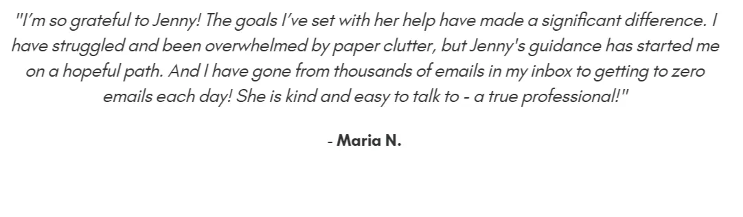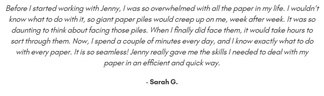 "Before I started working with Jenny, I was so overwhelmed with all the paper in my life. I wouldn’t know what to do with it, so giant paper piles would creep up on me, week after week. It was so daunting to think about facing those piles. When I finally did face them, it would take hours to sort through them. Now, I spend a couple of minutes every day, and I know exactly what to do with every paper. It is so seamless! Jenny really gave me the skills I needed to deal with my paper in an efficient and quick way." - Sarah G.