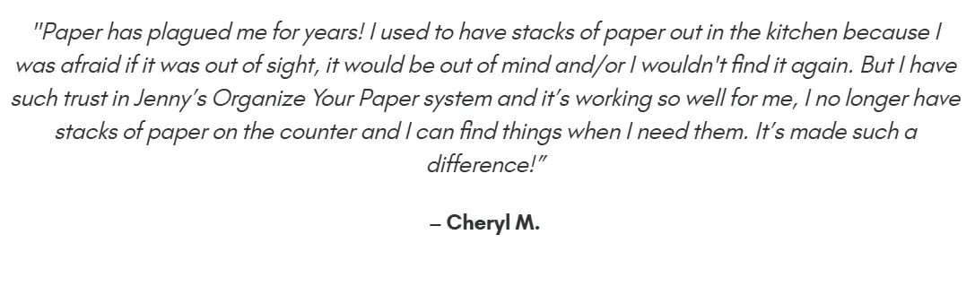 If you are tired of the paper overwhelm, Organize Your Paper (with it’s strategy, technique and coaching) is here for the rescue. Let’s get that paper under control so you can ditch the paper stress and live a pile-free life!