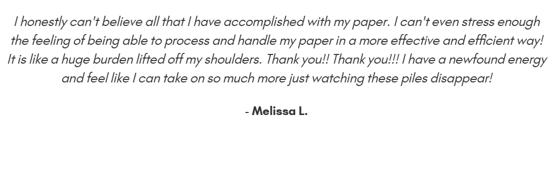 "I honestly can't believe all that I have accomplished with my paper. I can't even stress enough the feeling of being able to process and handle my paper in a more effective and efficient way! It is like a huge burden lifted off my shoulders. Thank you!! Thank you!!! I have a newfound energy and feel like I can take on so much more just watching these piles disappear!"